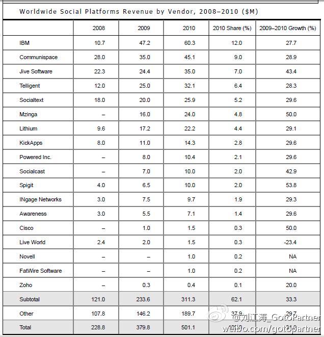 前路光明在望,要快马加鞭努力向前!@刘江涛_Jason:IDC 2011年6月数据:2010年全球企业社会化软件市场规模501M(5亿美元),比2009年增长31.9%;市场占有率前5:IBM、Communispace、Jive、Telligent、Socialtext。该数据没有细分到地区和国家。中国的Players可以各自估计一下。上IDC榜的,几乎清一色美国企业。