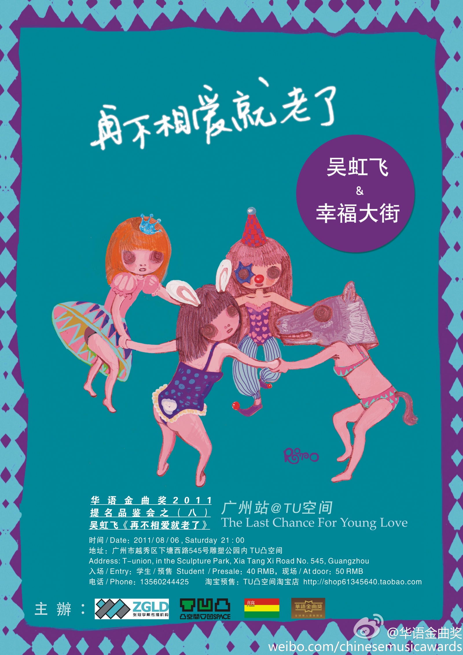 预祝演出成功,阿飞姐要获奖获奖!!@华语金曲奖:#华语金曲奖2011#提名品鉴会之(八)@吴虹飞 《再不相爱就老了》&幸福大街乐队专场。8月6日(周六)21:00 ,广州市越秀区下塘西路545号雕塑公园内@TU凸空间 票价:预售/学生40元,现场50元。电话:13560244425 。吴虹飞本次共获“最佳摇滚艺人”“最佳作曲人”“最佳编曲人”“最佳制作人”4项提名。