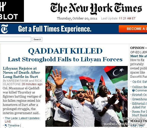 not happy for a death, though it's an end of chaos. hope it marks the start of a good new era, hope so@iStoryteller:纽约时报网站头条:Qaddaffi Killed。